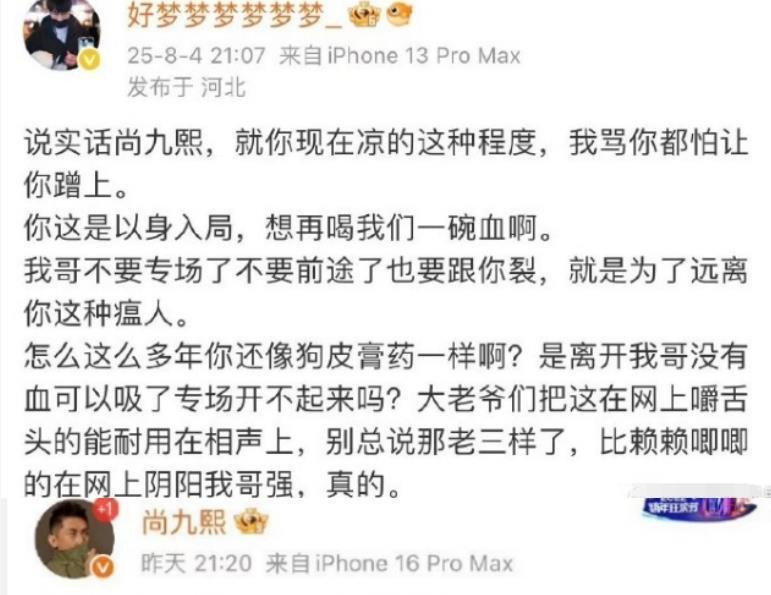 那么这件事王人已流程客岁了,为何尚九熙一刹要开撕呢。事情可追想到3天前尚九熙在献技返场时,终止粉丝条目接头和何九华的事情。这引起了不少何九华粉丝的不悦,有何九华粉丝跑去吐槽尚九熙一直蹭何九华流量,吐槽其是个瘟东说念主,狗皮膏药之类。尚九熙对其进行回怼,然后尚九熙点赞了维持我方的言论。随后“何九华,尚九熙”冲上热搜。尚九熙这才调不外,转头了这段旧事。