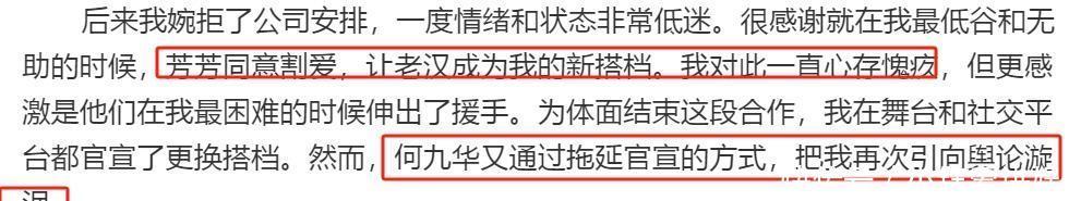 尚九熙在我方婉拒公司安排时,芳芳大致答应让出搭档郭宵汉,我方对此一直心存羞愧,谢意他们在我方最贫窭的时辰伸出了扶植。后续,我方为了能体面畛域这段关连在舞台和酬酢平台官宣换搭档,但何九华又通过延主座宣的情势,再次将我方引向公论旋涡。