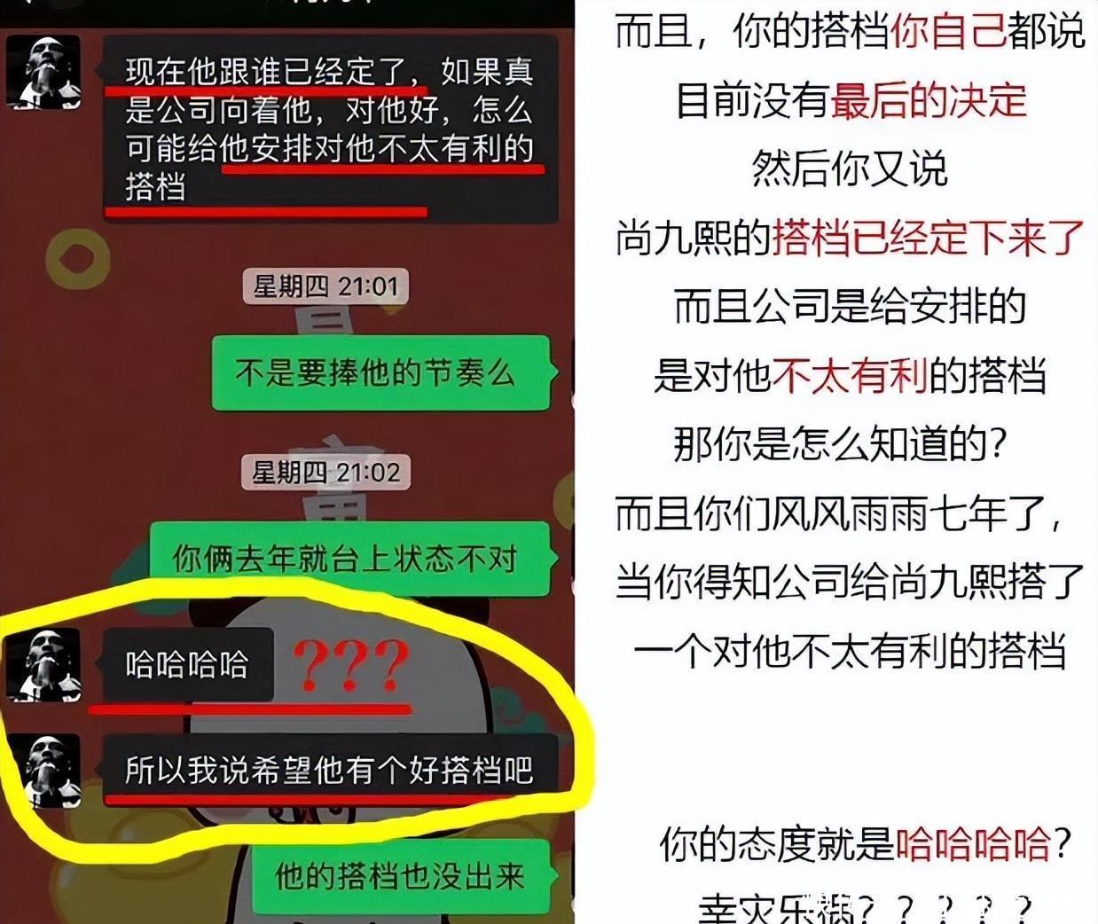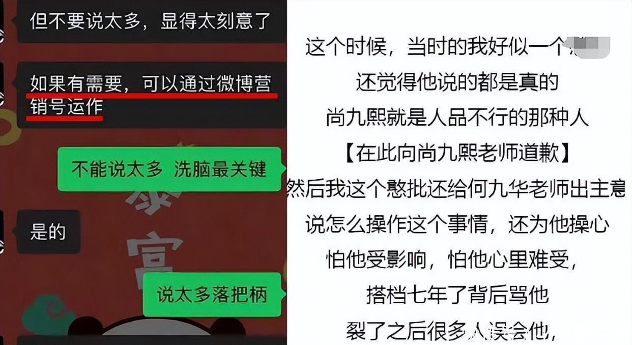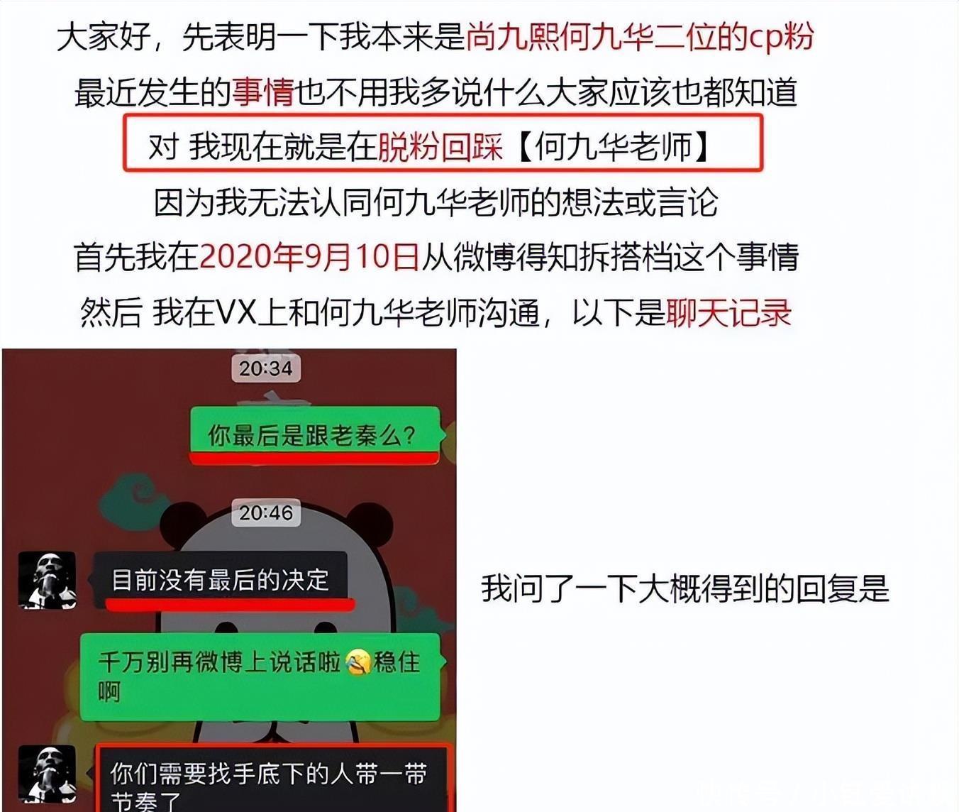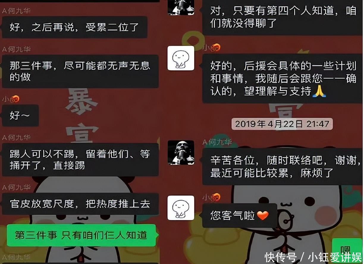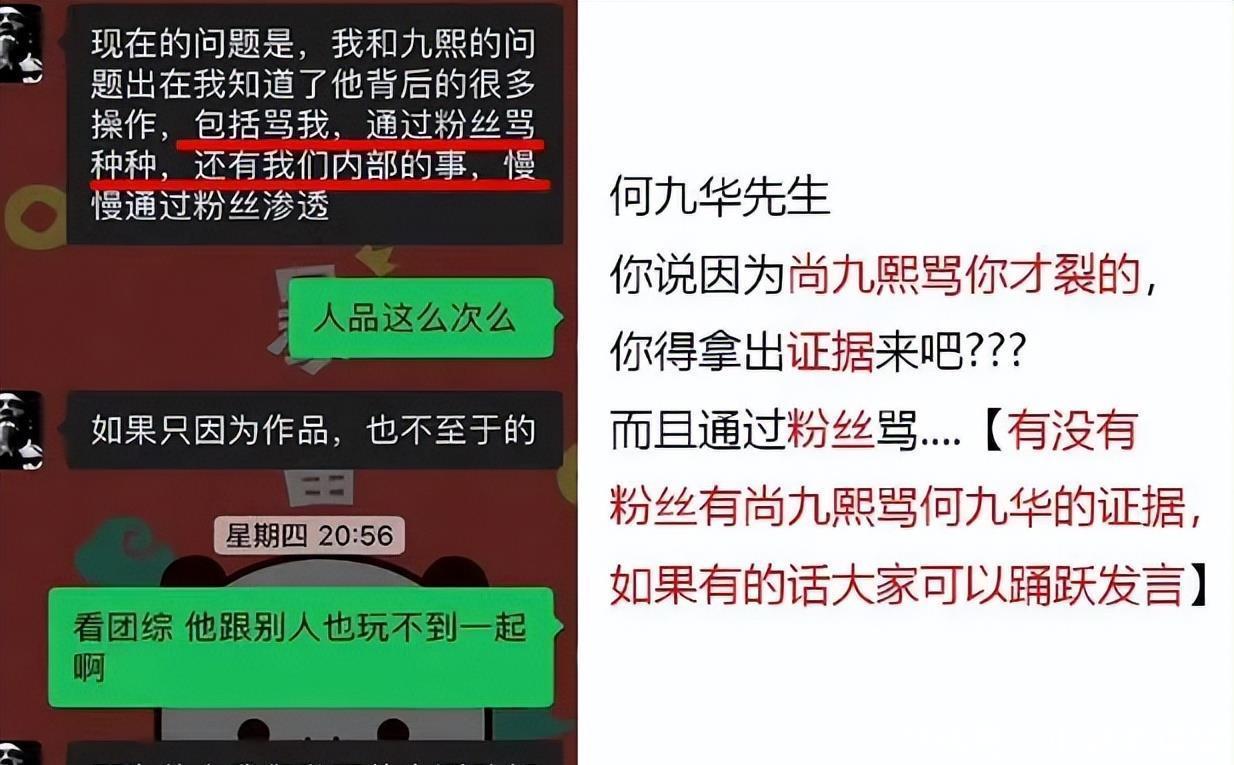 这位大粉一开动还以为两东说念主的“裂穴”是公司安排,但聊着聊着发现,一切王人是何九华在背后搞鬼,背刺尚九熙。是以,随后布告脱粉回踩,并爆出聊天记载。