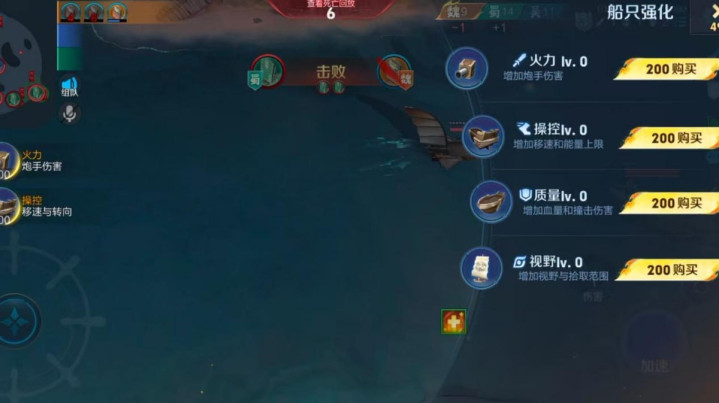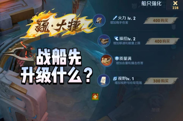 此次玩法的最大性情,那就是战舰可以升级,共有四个维度,分裂是火力(火炮伤害)、操控(移速及能量上限)、质地(血量及撞击伤害)、视线(视线与拾取限制),升级以200金币为基数,每升一级下次则需多增多100金币,最高可升至5级。那么应该优先讨论升级哪个呢?