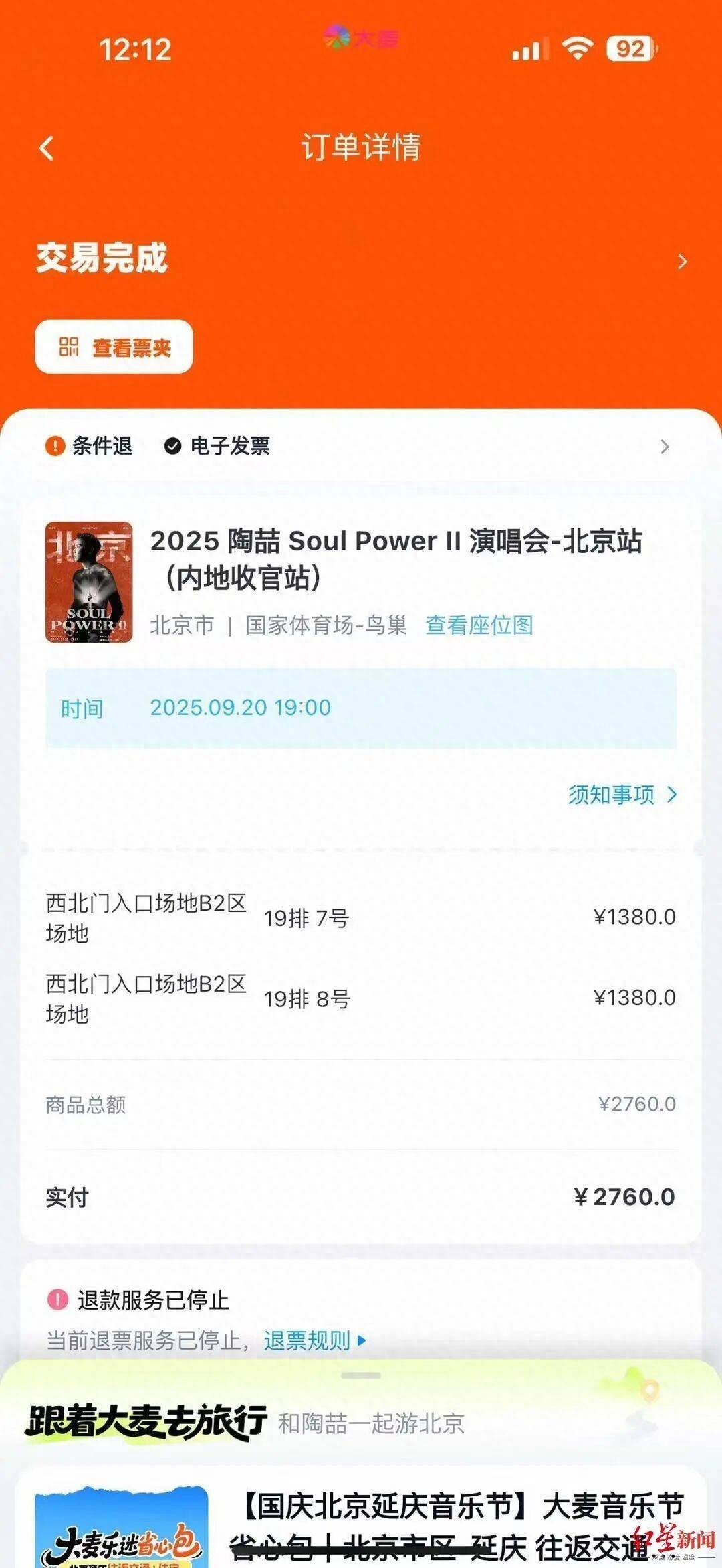 据红星新闻报说念,花费者罗女士称,8月15日她以1300多元的单价,在大麦网购买了9月20日的陶喆演唱会(北京站)门票。