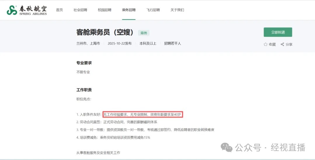 公开信息骄气,此前的空姐招聘经常在18-25周岁,部分航空公司放宽至28-32周岁。10月中下旬,王人门航空发布的招聘信息骄气,乘务长及以上东说念主员可放宽至35周岁。